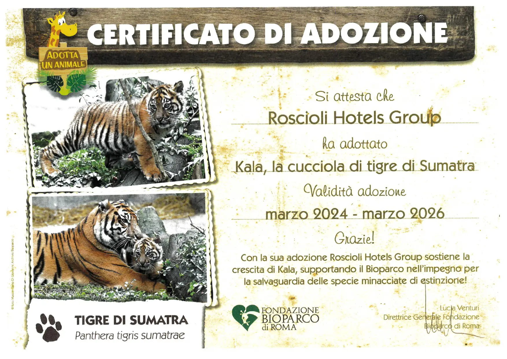 Impegnarsi attivamente sul tema della sostenibilità e del rispetto dell’ambiente attraverso la difesa delle specie animali che rischiano nei prossimi anni di scomparire. È questa la scelta della famiglia Roscioli, punto di riferimento dell’hospitality da oltre 90 anni, che ha adottato Kala, la piccola tigre di Sumatra nata a dicembre 2023 nel Bioparco di Roma.